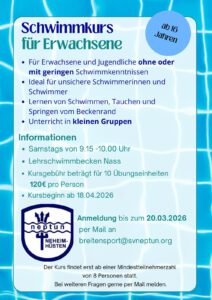 Möchten Sie sicher Schwimmen lernen oder Ihre Angst im Wasser verlieren? Ab dem 18. April 2026 bietet der SV Neptun Neheim-Hüsten einen speziellen Anfängerkurs für Erwachsene und Jugendliche ab 16 Jahren an.